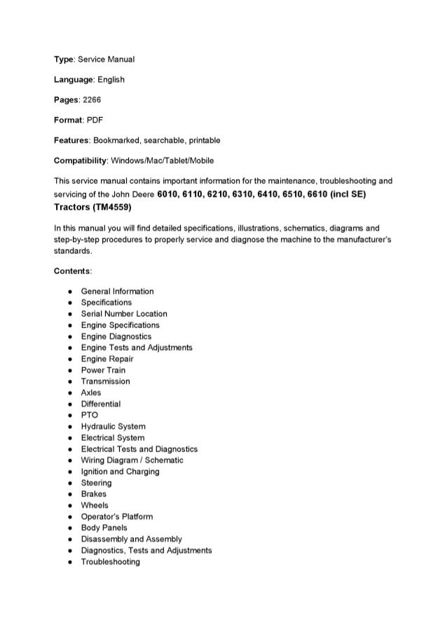 Illustrated diagrams included in the John Deere service manual PDF. Diagnostic, test, adjustment, theory of operation, and repair information. This John Deere Service Manual is compatible with all PC and Mac systems and is also easy to use on any smartphone, such as Android or iPhone.