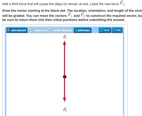 Redraw the diagram then add a third force that will cause the object to remain at rest. Redraw the diagram showing all three forces label the third force f 3. The location orientation and length of the vector will be graded. Label the new force 163958. Draw the vector starting at the black dot.