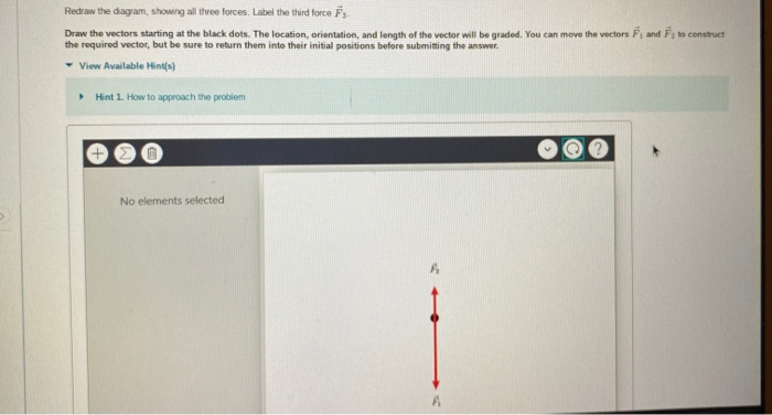 Redraw the diagram, showing all three forces. label the third force f⃗ 3.. Draw the force vector starting at the black dot. Redraw the diagram showing all three forces. Label the new force f 3. Redraw the diagram showing all three forces. Label the new force f3. That will cause the object to remain at rest. Draw the vectors starting at the black dots. The figure figure 1 shows two of the ...