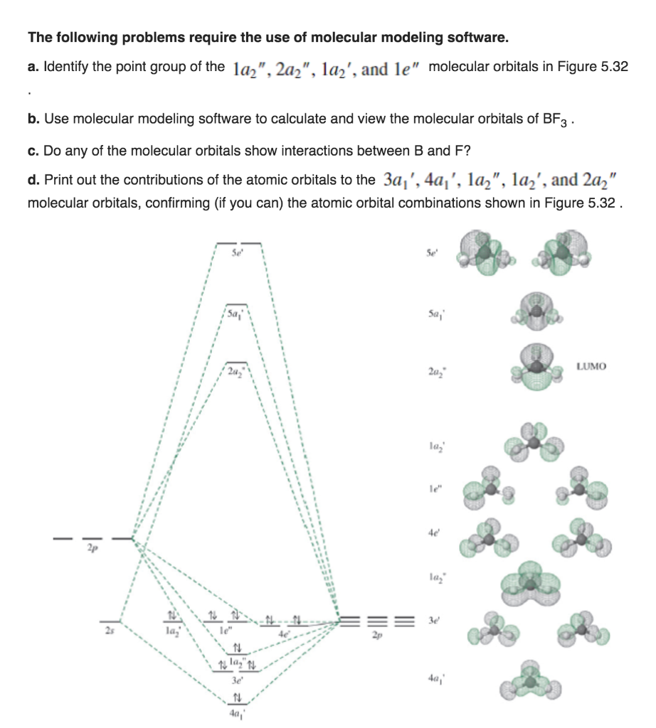 Highest Occupied Molecular Orbital and Lowest Unoccupied Molecular Orbital. The picture of the LUMO is a good representation of why the molecule is I can't say that I've ever modeled any orbital that wasn't HOMO or LUMO, so looking at all the MOs higher in energy than the LUMO is a bit of an... 365 MOLECULAR ORBITAL DIAGRAM KEY Draw molecular orbital diagrams for each of the following molecules or ions. Determine the bond order of each and use this to predict the stability of the bond. Molecular Orbital ~ a l c u l aitons. John D. Roberts. g. GO2 h. HzOz i. BF3. IN THE APPLICATION of molecular orbital theory to calculations of chemical binding energies, we shall use s e v e r a l basic principles, some of which w e r e mentioned in Chapter 1 and a r e given here by way... I'm trying to build a molecular orbital diagram for BF3 and I'm running into problems with irreducible representations on the F side. 2s for B has an irreducible I'm now stuck because I have 4 E' on the F side and only 2 E' on the B side. I found the following diagram for BF3 online but it doesn't generate...