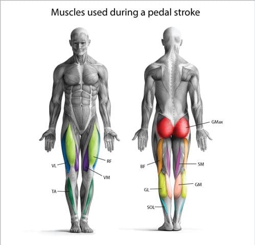 Thousands of thin spaghetti-like fibers make up muscle tissue. These fibers receive messages from the brain, causing the fibers to contract. The main muscles at work in cycling are the quadriceps and hamstrings in the upper leg, and the gastrocnemius and soleus in the calf. These muscles contract in a sequence that creates the pedaling action. These groups of muscle make up the largest volume of muscles used in a pedal revolution. Build Strength. When it comes to strength training for the bike, there is not one group of muscle that is more important to focus on than the other. All of the muscles listed above play a key role in producing power on the bike. Mar 17, 2016 · The hip flexors are the cycling muscles that run down the front of your hips and help lift the pedal back up to high noon for another go ‘round, accounting for about 4 percent of your pedaling ... Nov 14, 2021 · Muscles used in cycling diagram. With cycling's focus on aerobic capacity, metabolic capabilities, and ability to suffer, it can be easy to forget that all of these important aspects are what drive your muscles that power the bike. The primary muscles used in cycling are the gluteal muscles, quadriceps, hamstrings and calf muscles.