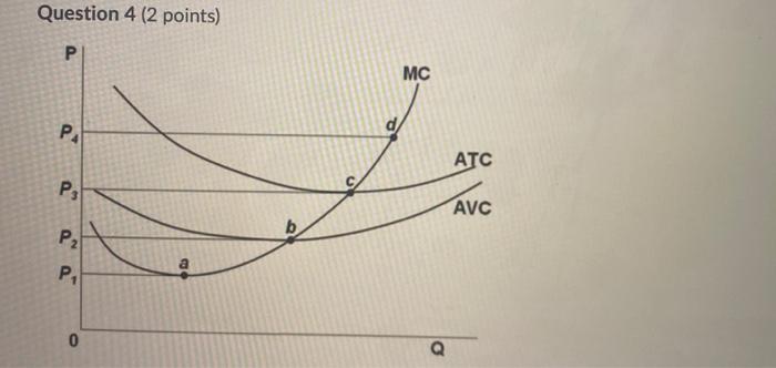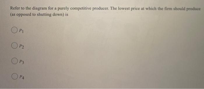 refer to the diagram for a purely competitive producer. The lowest price at which the firm should produce (as opposed to shutting down) is a) P1 b) P2 c) P3 d) P4. b. refer to the diagram for a purely competitive producer. The firm's short-run supply curve is a) the abcd segment and above on the MC curve b) the bcd segment and above on the MC curve c) the cd segment and …