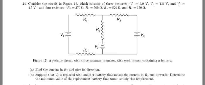 Solved Consider the circuit shown in the diagram below. The | Chegg.com. Consider the circuit shown in the diagram below. The battery has a voltage V= 12.0 V and the resistor R1 3.45 Ω; R2 6.90 Ω; R3-17.25 Ω; R4-10.35 Ω How much current flows through each of the four resistors? What is the total current delivered by the battery?