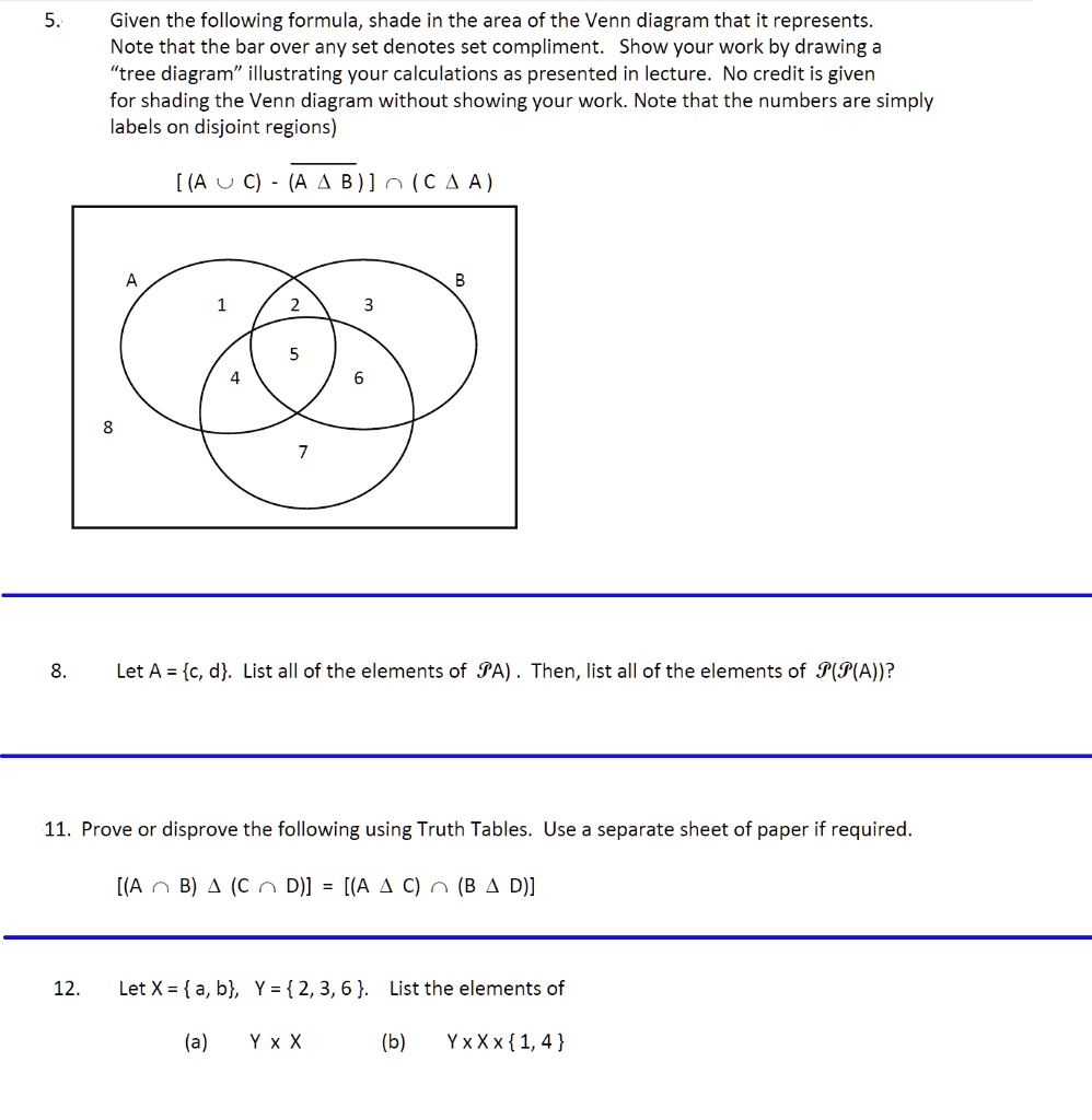 Sets_and_venn_diagrams Venn diagrams with complements, unions and intersections. Sets are represented in a Venn diagram by circles drawn inside a rectangle representing Before solving problems with Venn diagrams, we need to work out how to keep count of the elements of overlapping sets. The upper diagram to the... How To Solve A Venn Diagram Problem Involving Three Sets? Intersection Of Three Sets using Venn Diagrams, how to solve problems using the Venn Diagram of three sets, how to shade regions of Venn In general, there are many ways that 3 sets may intersect. Some examples are shown below. How To Shade Regions Of Venn Diagrams Involving Three Sets. Formulas to solve 3 overlapping sets in venn diagram ... Formulas to solve 3 overlapping sets in venn diagram. cat / By CetKing. There are two basic formulas that we already know: 1) Total = n (No Set) + n (Exactly one set) + n (Exactly two sets) + n (Exactly three sets) 2) Total = n (A) + n (B) + n (C) – n (A and B) – n (B and C) – n (C and A) + n (A and B and C) + n (No Set) From these two ...