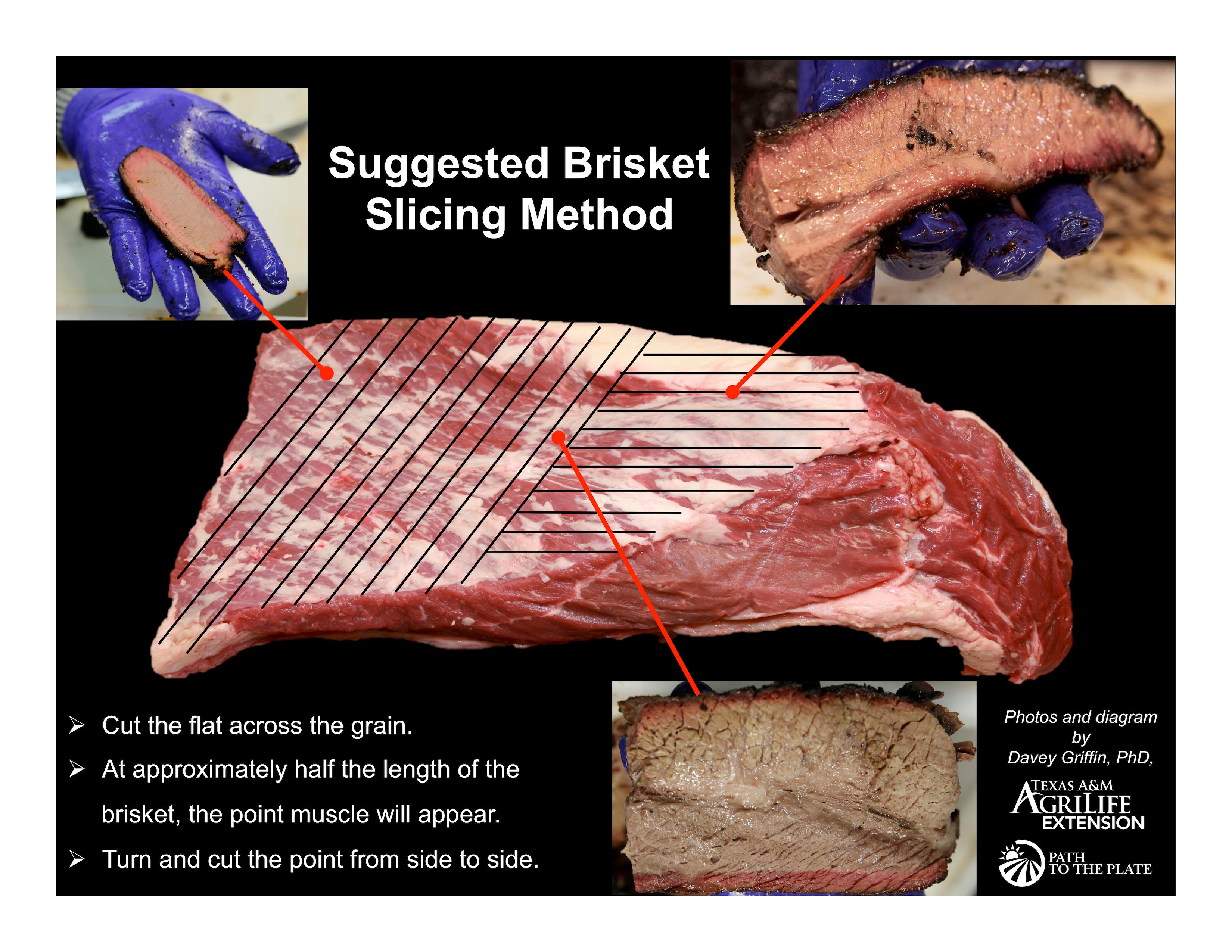 Anatomy of a Texas BBQ Brisket - Low & Slow BBQ 4) When you're making Classic Burnt Ends (page 86), you'll separate the fatty point from the flat on a cooked brisket - you do this by running a sharp knife horizontally along the fat seam between the two sections. The side view of a brisket will help you locate that fat seam. When slicing a brisket, always cut across the grain.